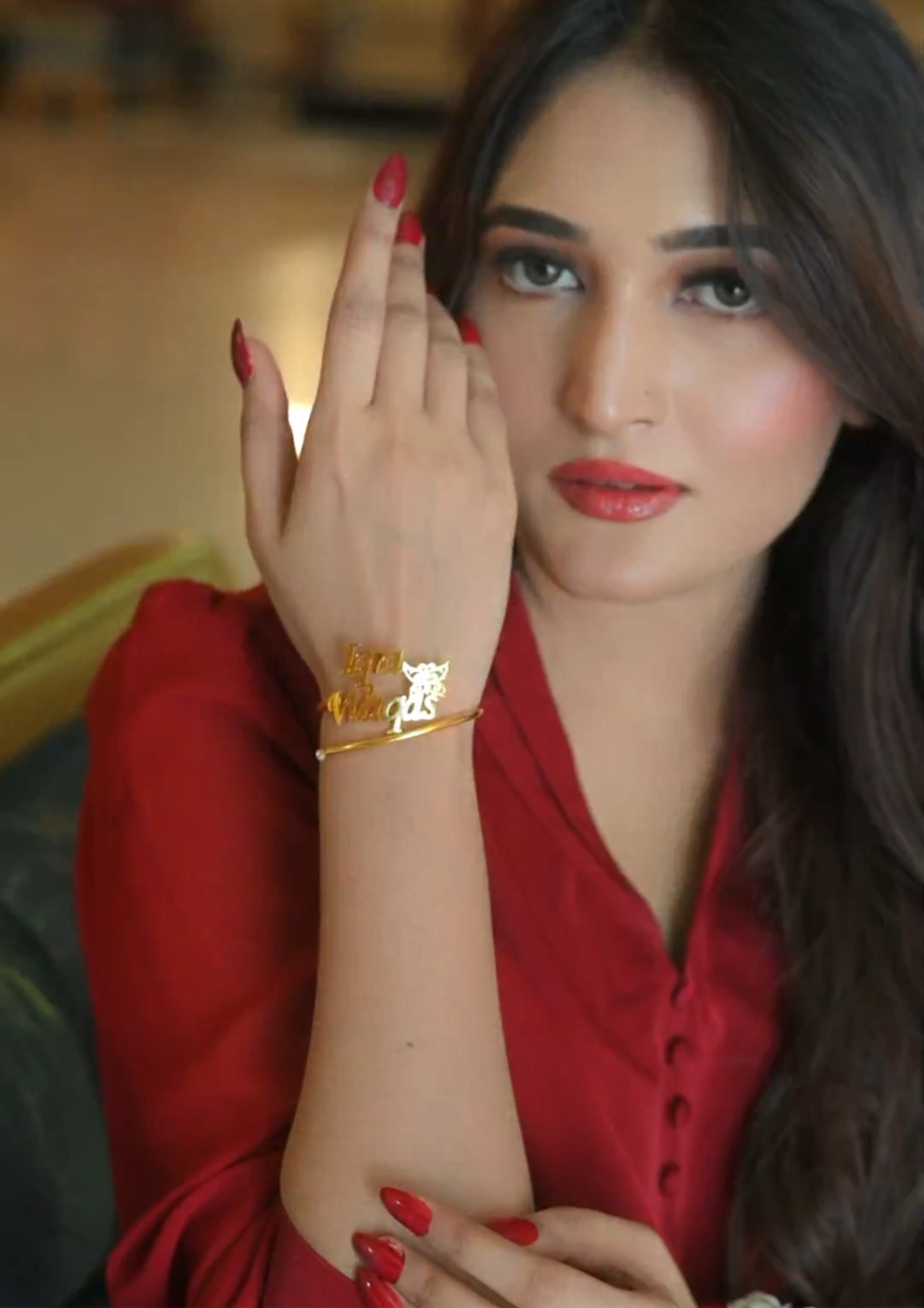 A customized name bangle with a butterfly design is truly a unique and beautiful piece of jewelry. The graceful wings of the butterfly symbolize growth, transformation, and beauty. Imagine delicate and intricately designed wings, shimmering in gold, gently wrapping around the personalized name on the bangle. The combination of the personalized touch with the enchanting butterfly design creates a stunning and meaningful accessory that is sure to catch the eye and spark admiration.